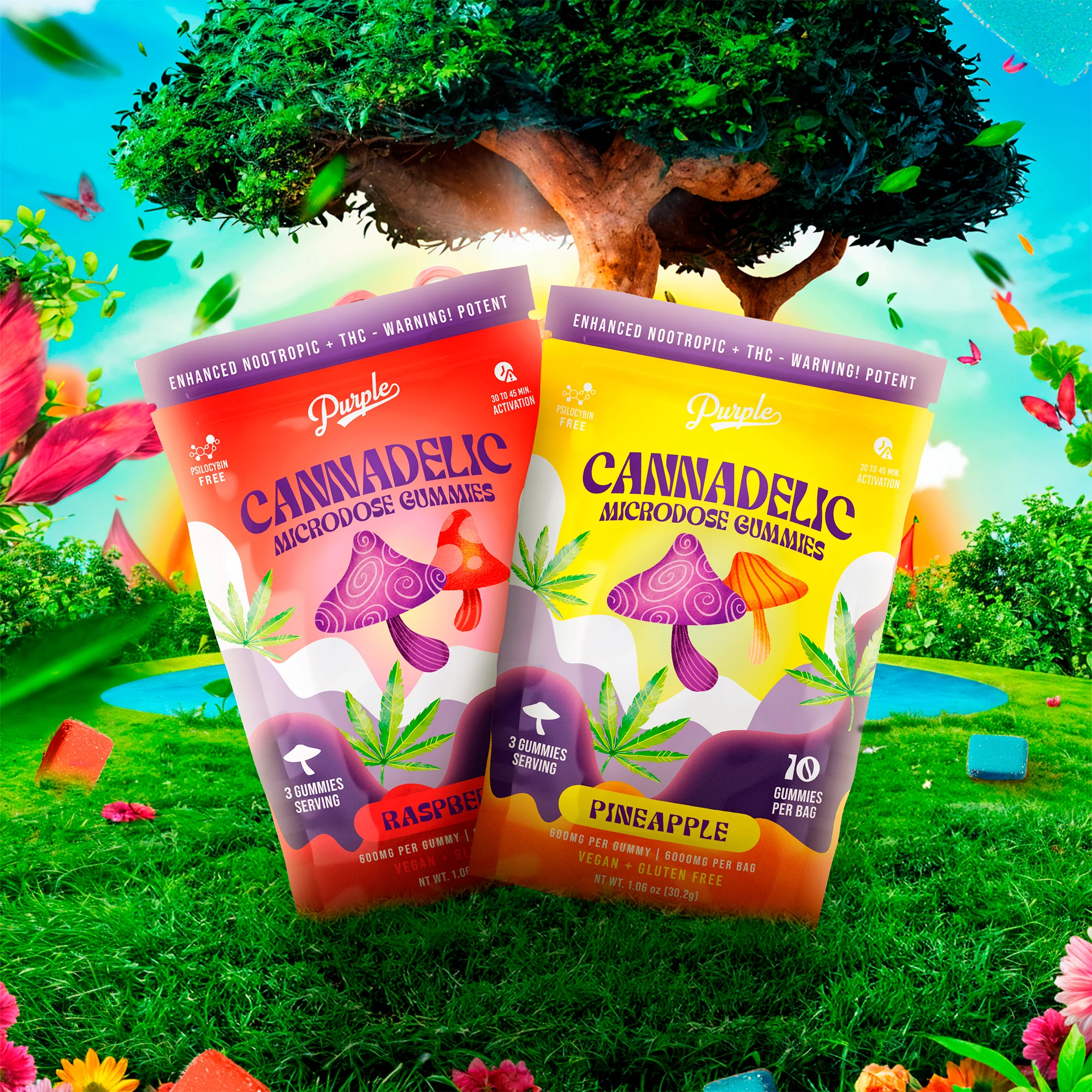 Purple Cannadelic Microdose Gummies come in a 10ct resealable pouch. Each fruity, juicy, flavor-packed gummy contains a 600mg proprietary blend of THC-V and Magic Mushrooms!